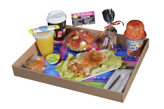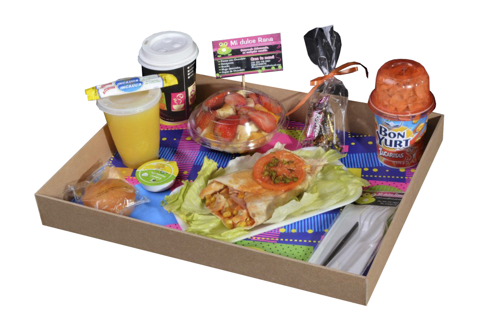 Comidas Mi dulce Rana : Trozos de pollo en salsa BBQ, bolitas de carne molida, papas apanadas, arepas rellenas de queso, salsa de la casa (mostaza o pimentón) gaseosa o jugo natural y chocolatinas; decorado dentro en un lindo empaque en papel celofán y bomba metalizada con motivo de acuerdo a la ocasión.