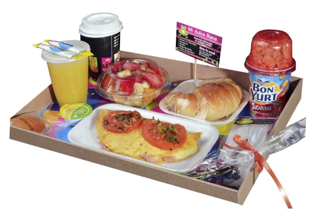 Desayuno Mi Dulce Rana Opción 2: tortilla gratinada con champiñones,papa, espinacas, pimentón, rodajas de tomate salteadas en aceite de oliva con un toque de albahaca, croissant, ensalada de frutas, jugo de naranja natural, bebida caliente (café con leche o chocolate), bon yurt, pastelito dulce, mantequilla mini, chocolatinas; decorado en un lindo empaque en papel celofán y bomba metalizada con motivo de acuerdo a la ocasión.